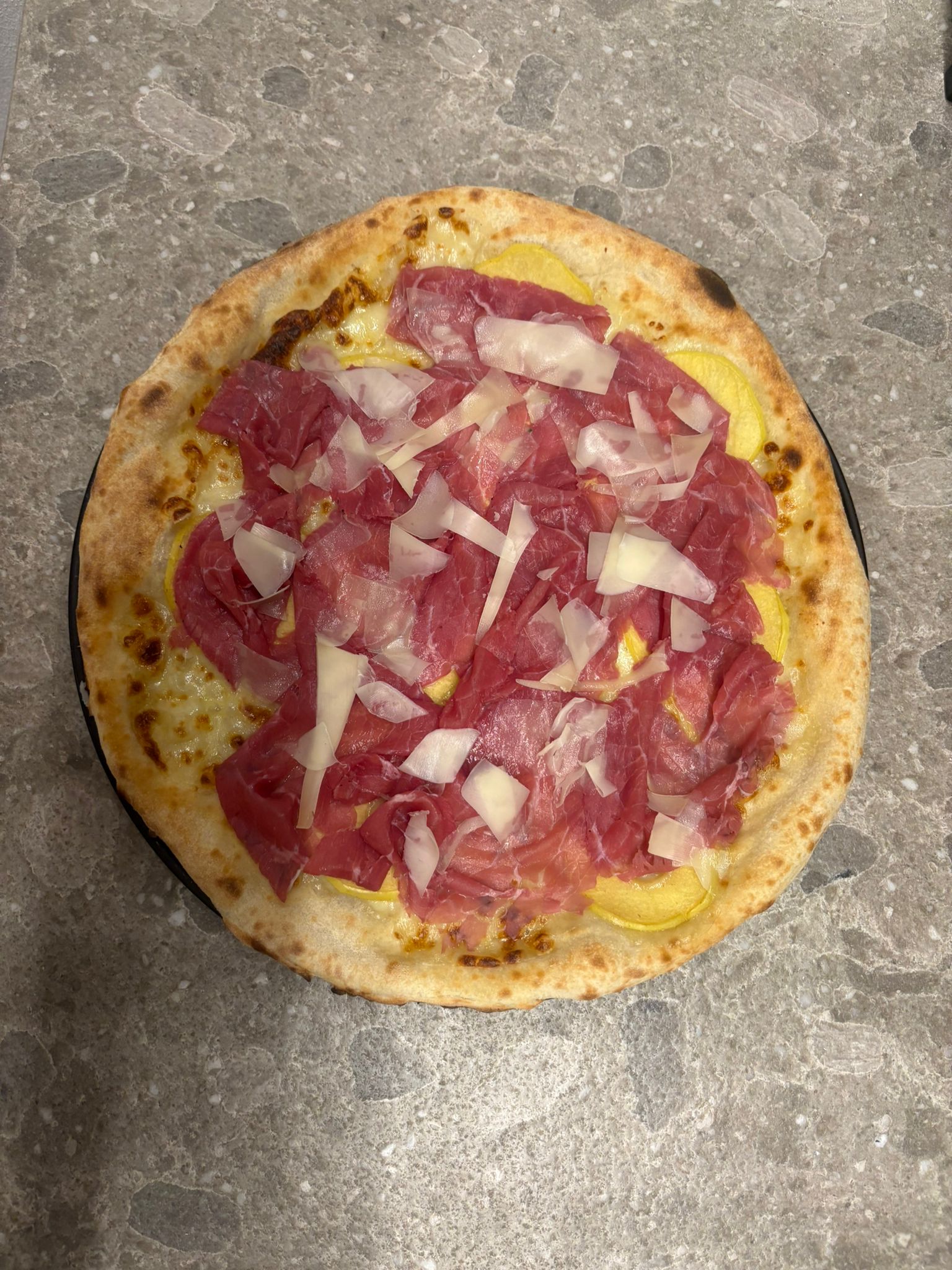 Mozzarella Fior di Latte, Mele, Carne Salada fuori cottura, Formaggio Asiago fuori cottura