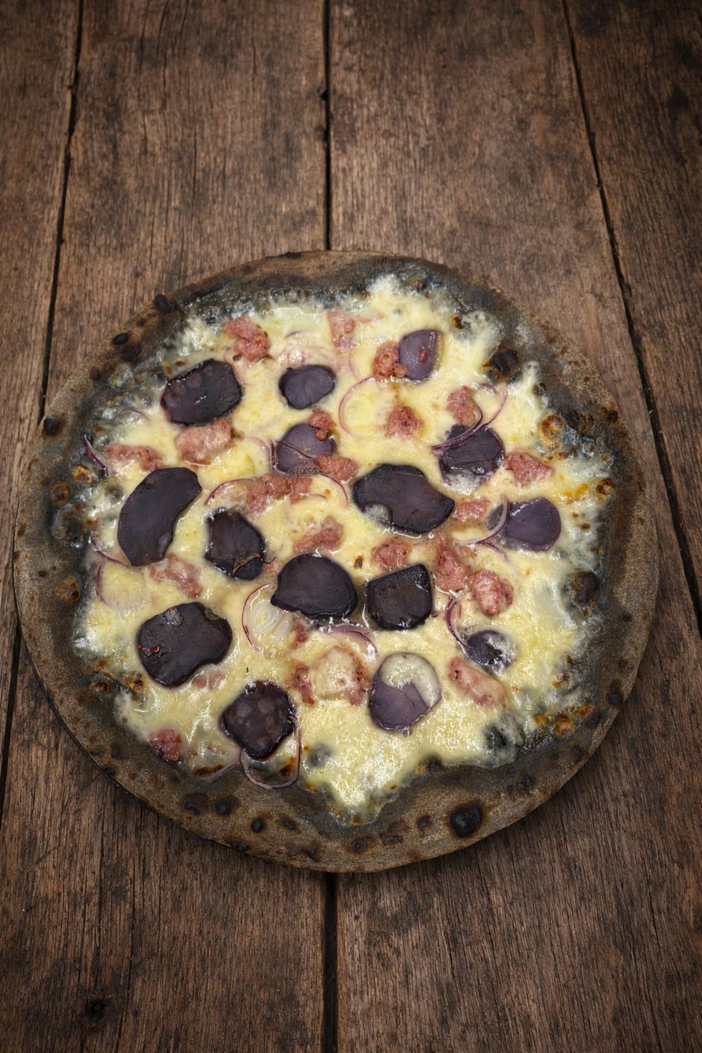 Impasto al Carbone, Mozzarella Fior di Latte, Patate Viola, Formaggio Asiago, Cipolla Rossa, Salsiccia